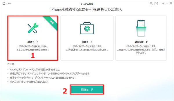 Step 3. iPhoneの場合によって修復モードを選択します。まず「標準モード」を試してみてください。