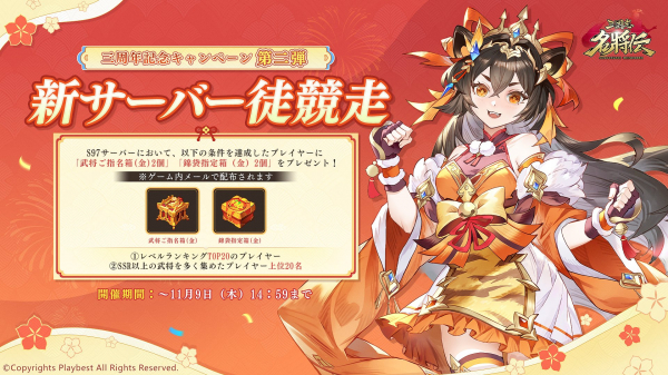 Playbest Incは、現在好評配信中のスマートデバイス向けゲーム「三国志名将伝」が、2023年11月19日(日)をもちましてサービス開始から3周年を迎えます。運営一同、応援してくださるユーザーの皆様に深く感謝を申し上げますとともに、3周年を記念したイベント、キャンペーン実施いたします。