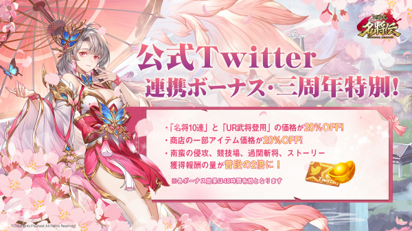 毎週木曜日に実施中の「Twitter連携ボーナス」配布イベントを、3周年期間中は抽選によるプレゼント配布を行わず、特別に全てのプレイヤーの皆様にプレゼントいたします。商店価格などが優遇されるボーナスとおまけ元宝を組み回せて、有利なゲーム進行にご活用ください。