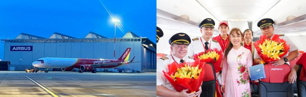 (写真左)ベトジェットの101機目がハンブルグ空港を出発し、ホーチミンのベトジェット拠点へ