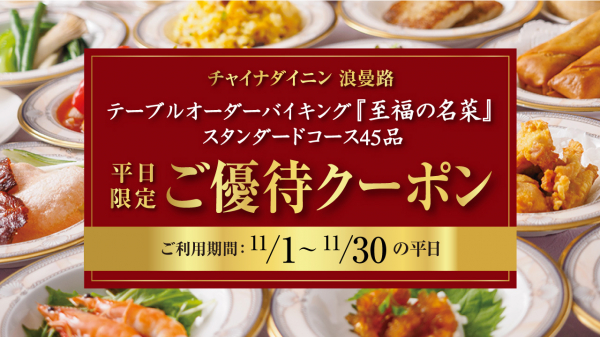 チャイナダイニン 浪曼路でオーダーバイキング『至福の名菜』スタンダードコースご優待クーポン配布中!