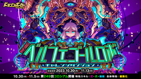 株式会社アソビズム(本社:東京都千代田区、代表取締役:大手智之)は、App Store・Google Playにて 好評配信中のリアルタイム合体カードバトル『ドラゴンポーカー』で、2023年10月30日(月)より新チャレンジダンジョン「発進!ベルフェゴールロボ」を開催いたします。
