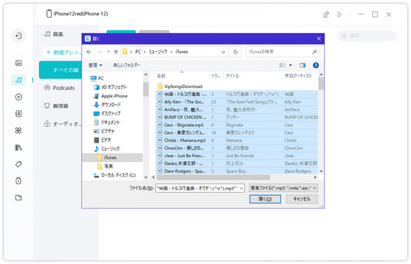 Step4: フォルダ選択画面が表示されるので、パソコンに取り込んだCDの保存先フォルダを選択して、中の曲をすべて選んで「開く」ボタンをクリックします。