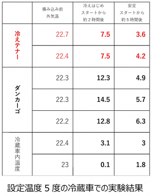 「冷えテナー」では、前面背面のパネルがないため、トラック内の冷気がボックス内にいきわたりやすく、通常のダンカーゴに比べ、急速にボックス内を冷やすことができます。通常のダンカーゴも断熱性はないため、冷蔵車・冷凍車で温度を保ちながらの輸送は可能になりますが、特に冷えはじめ(2時間後)において、通常のダンカーゴと冷えテナーでは5〜7℃の温度差が確認できました。