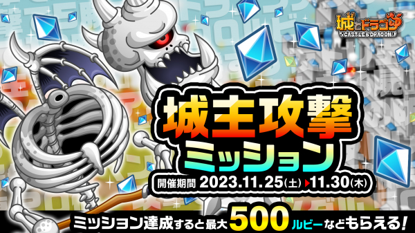 11月25日(土)より、用意されたミッションをクリアすると最大500ルビーなどがもらえる「城主攻撃ミッション」を開催いたします。さらに、11月の新キャラ“サイクロスケルトン”率いるキャラ達が襲来してくる「一つ目、目白押し!」やスキルや武具の開発がしやすくなる「開発強化キャンペーン」、毎日のログインで「ホネ×メのアバたまチケット」やアイテムがもらえる「もみじ狩りログインボーナス」なども開催!この機会にぜひ『城とドラゴン』をお楽しみください。