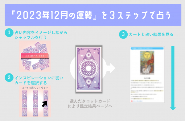 利用者は、12月の運勢をタロット占い機能により占うことができます。このタロット占いはワンオラクル方式(1枚引き)で行い、シャッフル後に展開された9枚のなかからインスピレーションを得た1枚を選ぶことで占うことができます。