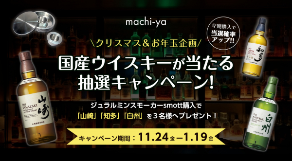 machi-yaにてsmottを購入された20歳以上の方の中から抽選で、国産ウイスキー「山崎」「白州」「知多」が当たるキャンペーンを開始いたしました。