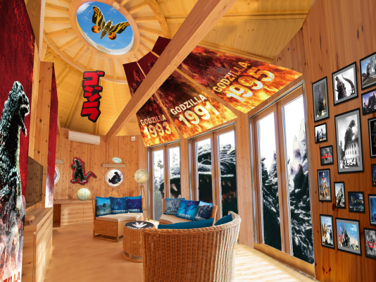 室内には、歴代ゴジラと人気怪獣たちが描かれたインテリアやタペストリー、窓越しに見える実寸大ゴジラの一部、さらに、それらに光の照射で見え方が変わる特殊加工を施すことによって、昼・夜で異なった室内の雰囲気をお楽しみいただけます。室内に隠れた全ての怪獣たちを見つけ出すことで豪華特典が手に入る“特別任務”に挑戦していただくなど、昼夜通してお愉しみいただけるお部屋です。