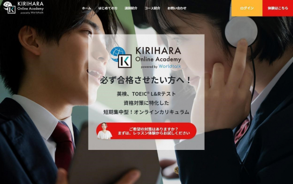 「KIRIHARA Online Academy」は、桐原書店の教材・カリキュラムとワールドトークの日本人英会話講師による、TOEIC対策・英検対策に特化したオンライン学習サービスです。