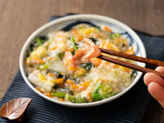 わんまいるでは、経営理念でもある、「日本の農業、漁業の振興に貢献」をもっとうに、商品開発において、できる限り国産食材を使うようにしています。今回は、紅ズワイガニの水揚げ日本一である鳥取県境港産の紅ズワイガニを使い、白菜、小松菜、大根、人参といった冬野菜と一緒に、トロトロのあんかけだしで煮込み、仕上げに溶き卵を混ぜこみました。寒いこの時期にあつあつのあんかけ煮込みで体を温めてください。そのままおかずとしてもおいしくいただけますし、ごはんの上にのせて丼ぶりにしたり、ラーメンに乗せてあんかけラーメン等もお楽しみいただけます。