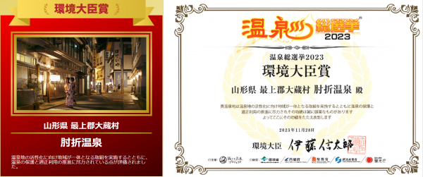 5省庁(環境省、内閣府、総務省、経済産業省、観光庁)の後援で観光地の活性化プロジェクトを実施している温泉総選挙(主催:旅して日本プロジェクト、運営事務局:一社)日本エンパワーメントコンソーシアム、本社:東京都渋谷区、温泉総選挙総合プロデューサー/社会起業家:山下 太郎)は、11月28日開催された『温泉総選挙2023』表彰式にて、温泉地の取り組みを評価する省庁賞4賞、特別賞8賞を発表し、環境大臣賞は「肘折温泉(山形県最上郡大蔵村)」が受賞いたしました。