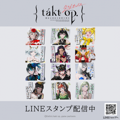 DeNAとバンダイナムコフィルムワークスによる世界を調和に導くシンフォニックRPG「takt op. 運命は真紅き旋律の街を」のLINEスタンプ第1弾がインクルーズより配信開始!是非、LINEスタンプでも「takt op. 運命は真紅き旋律の街を -Vol.1-」の世界観をお楽しみください。
