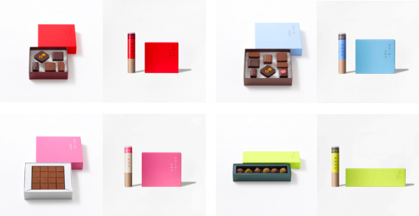 バニラ風味ビターチョコレート、カカオ片入りヌガティーヌ入りビターチョコレート、カシス風味ビターチョコレート、パッションフルーツ風味ミルクチョコレート、キャラメリゼしたミルクチョコレート
