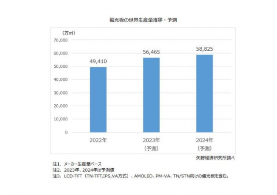 【矢野経済研究所プレスリリース】偏光板・部材フィルム世界市場に関する調査を実施(2023年下期)〜2023年の偏光板の世界生産量は前年比114.3%の56,465万m2を予測〜