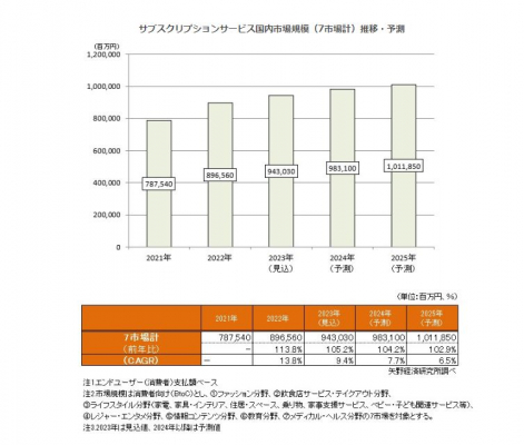 2023年の消費者向け(BtoC)サブスクリプションサービス国内市場規模(7市場計、レンタルサービスを対象とし、定期宅配サービスは除く)は、エンドユーザー(消費者)支払額ベースで前年比5.2%増の9,430億3,000万円を見込む。