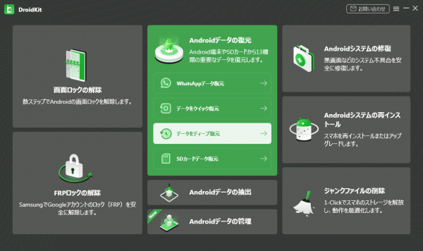 ステップ1:コンピューターにDroidKitをインストールして開きます。「Androidデータの復元」カテゴリの「データをディープ復元」をクリックしてください。