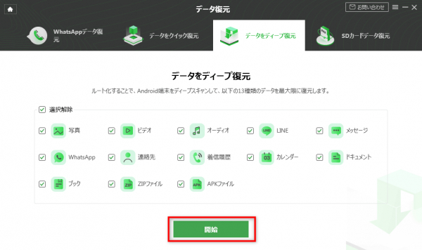 ステップ1:PhoneRescue for Androidをコンピュータにダウンロードして開きます。Androidデバイスをコンピュータに接続します。次に、「開始」をクリックします。