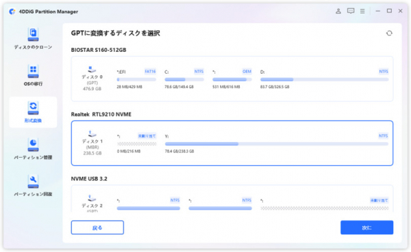 では、4DDiG Partition ManagerでMBRとGPTディスクを相互変換する手順を紹介します。