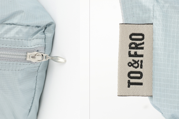 メタリックな生地感をお楽しみいただくため、オーガナイザー本体にロゴプリントはあえて施さず、小さめの「TO&FRO」ロゴがはいった織ネームを挟み込んだデザインを採用、ファスナーには、オーガナイザーAIRと同じくシンプルなシルバーを選びました。