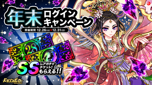 期間中、5日間ログインすると、竜石が最大20個もらえる「年末ログインキャンペーン」を開催いたします。ログイン5日目には「SSレアガチャチケット」が必ずもらえます。毎日ログインして、豪華報酬を受け取りましょう!