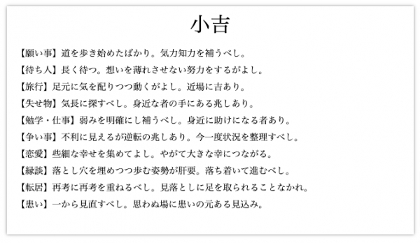おみくじの中身は、いたって一般的。凶から大吉まで多種多様のメッセージが込められたおみくじが入っています。「願い事」や「待ち人」から「恋愛」まで、たとえばこんな形式で結果が提供されるんです。
