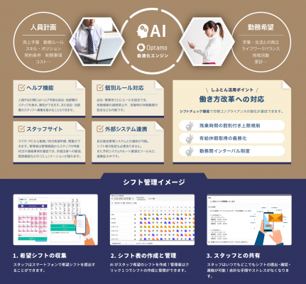 「しふとん」は、みんなが納得するシフトを"AIのチカラ"を使って誰でも作ることができる、勤務シフト最適化クラウドサービスです。従来は手作業でおこなわれていた「シフト作成」作業をAIが代替し、公平で均一なシフトをご提案。現場責任者は、接客やスタッフ支援などの本来業務に集中することができるようになります。またシフト情報のデータベース化により、店長の変更時も前任者からの引継ぎがスムーズです。さらに、残業時間の上限などの複雑な就業規定に対応したシフトのチェックもできるため、労務コンプライアンスの強化も期待できます。