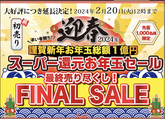 クルーズ予約サイト「ベストワンクルーズ」運営の株式会社ベストワンドットコム(本社:東京都新宿区、代表取締役:澤田秀太)は、大好評につき、1月20日(土)までとしていた「謹賀新年総額1億円スーパー還元お年玉セール2024年」を2月20日(火)まで延長にいたしました