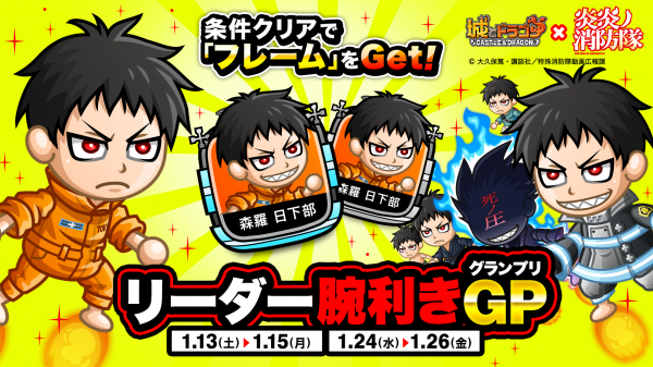 1月24日(水)より、TVアニメ『炎炎ノ消防隊』コラボ限定キャラ「森羅 日下部」をリーダーにして「キャラフレP」を競う、「リーダー腕利きGP」の2回戦目が開催!ランキング上位者や条件を達成した方には、コラボ限定「キャラフレーム」が贈られます。「森羅 日下部」をリーダーにして期間中のリーグに挑みましょう!