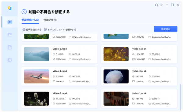 (2)「動画を追加する」ボタンをクリックし、破損した動画を追加します。「修復開始」ボタンをクリックすると、プログラムは自動的に動画を修復します。