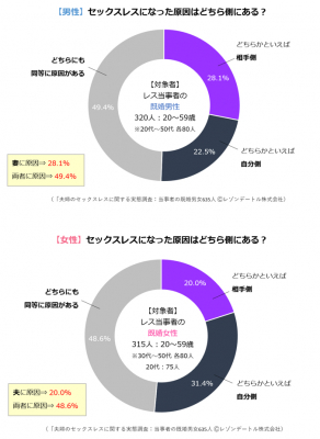 結果は、男女とも「どちらにも同等に原因がある」という答えが約5割になりました。次に多かったのは、男女とも「妻に原因がある」でした。夫婦間セックスレス(以下、夫婦レス)では、女性の3人に1人が「自分に原因がある」ととらえていることになり興味深い結果です。その理由は、後半で明らかになります。