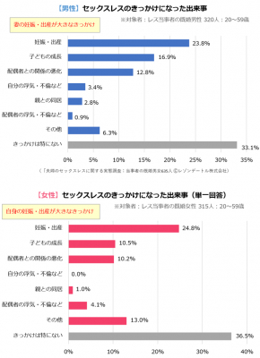 選択肢から一つを絞る形で「セックスレスのきっかけになった出来事はなにか」を尋ねたところ、次の結果になりました。最も多い回答は「きっかけは特にない」で35%前後となりましたが、男女とも「妊娠・出産」がきっかけと回答する人が25%近くになりました。