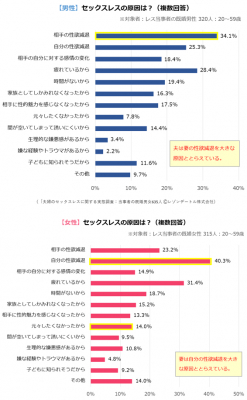 男女別に「セックスレスの原因はなにか」を尋ねました。原因は複合的でしょうから複数の選択肢を選べる複数回答としています。
