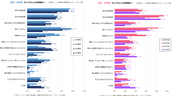 年齢層別に結果を分析すると、女性は20代から「自分の性欲減退」を原因とする割合が4割をこえることが注目されます。20代では「疲れているから」も4割を超えて突出しており、「妊娠・出産」に伴う慣れない乳幼児の育児が負担になっていることが想像できるでしょう。また、40代で「自分の性欲減退」を原因とする割合が明らかに低下することにも注目されます(28.8%)。