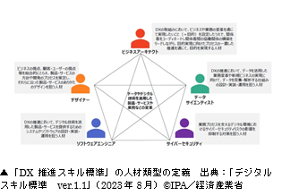 なかでも「DX推進スキル標準」は、DX推進に必要な人材類型(ビジネスアーキテクト/デザイナー/データサイエンティスト/ソフトウェアエンジニア/サイバーセキュリティ)を右図のように定めています。