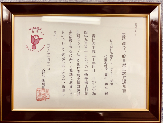 正真正銘自分の髪 リーブ21 (本社:大阪市中央区、代表取締役社長:岡村勝正、以下「リーブ21」) がこの度、厚生労働省が実施する認定制度において、2024年1月11日付けで次世代育成支援対策推進法に基づく「くるみん」の基準適合一般事業主に認定されました。