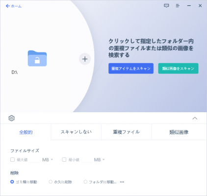 ステップ2:重複ファイルを「ごみ箱に移動する」や、「スキャンの対象データをファイルサイズで絞る」などの設定を確認したうえで、スキャンを開始します。