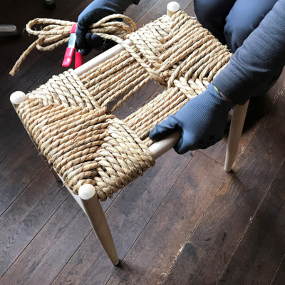 座面に、藁縄(わらあみ)を編み込んでスツールを完成させます。脚の部分は、組み立て・オイル仕上げ済みのものを用意しておりますので、長く安全にお使いいただけます。