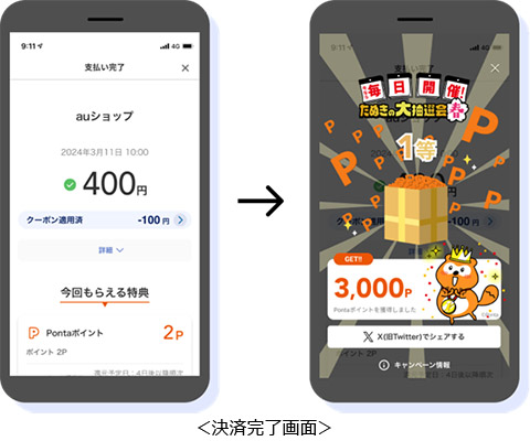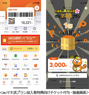 抽選結果は1等から5等まであり、1回の抽選ごとに最大3,000Pontaポイントがあたります。支払い完了後に自動で抽選を行い、結果はその場で表示されます。さらに、auマネ活プラン(https://www.au.com/pr/moneyactivity/plan/?utm_source=aucom&utm_medium=web&utm_campaign=bigtopics_20240130_29991231)に加入中のお客さま向けに、1回の支払いで2回分の抽選を実施できる特典を今回新たに提供します。
