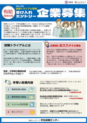 京都ジョブパーク学生就職センターでは主に3回生以下の学生を対象とした中長期の有給職場体験(就職トライアル事業)を実施しております。