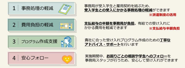 また、学生やその周囲の人に貴社をアピールできたり、学生から新しいアイデアや知見を得ることができるなど、工夫次第で新たな人材の発掘、企業のイメージアップ、職場の活性化、採用活動の一環などの多くのメリットが得られます!