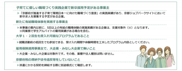 当事業では、大学生が京都企業での就業を体験し、企業に対する理解を深めることで京都の企業への就職を促進することを目的としています。事業内容をご覧いただき、ぜひ学生の受入れをご検討いただきますようお願いいたします。