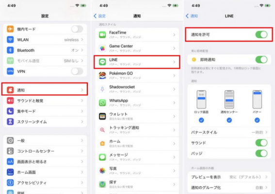 通知がそもそも来ない設定になっていれば、LINEに通知は届きません。そのため、設定を変更する必要があります。