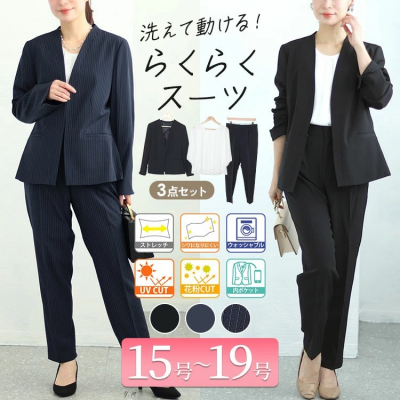 サイズは15号〜19号を取り扱い、ブラック・ネイビー・ストライプの3色での展開。フルセットで揃えて着回していくことで、オフィスコーデを揃えるわずらわしさからも解放されます。