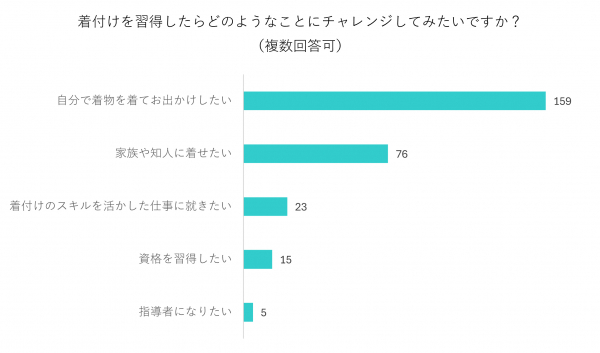 最も多かったのが「自分で着物を着てお出かけしたい」で159票でした。次いで「家族や知人に着せたい」76票、「着付けのスキルを活かした仕事に就きたい」23票、「資格を習得したい」15票と続きます。多くの人が「自分で着物を着られるようになりたい」と考えていることがわかりました。