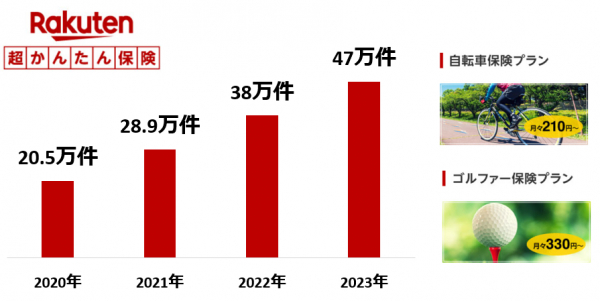 「楽天超かんたん保険」は自転車保険プランやゴルファー保険プランなど、楽天会員の皆さまのニーズに応じた補償を備えた保険です。2016年9月の発売以降、ご契約件数は順調に伸長し、累計で約47万件となっています。(2023年12月31日時点)