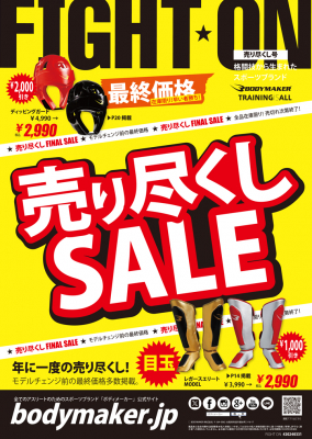 BODYMAKER(ボディメーカー)は、日頃のご愛顧に対する感謝の気持ちを込めて、2月22日(木)より3月31日(日)まで、BODYMAKER公式サイト及び、直営店舗にて、究極の最終価格に挑戦!在庫限りの「決算売り尽くしSALE」をスタートします。また同時に同タイトルのDMを発行しました。今回はモデルチェンジ前の価格を多数掲載しています。一例として紹介すると、超目玉アイテムとして、空手必須アイテム「ディッピングガード」¥4,990→¥2,990の¥2,000引きや「レガースエリートMODEL」¥3,990→¥2,990の1,000引きなど多数掲載。BODYMAKER(ボディメーカー)は、今回、究極の最終価格に挑戦します。DM・BODYMAKER公式サイトともにわくわくドキドキ…。ぜひ、一度ご覧ください。