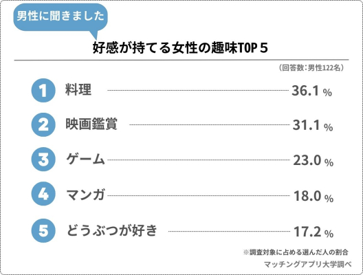 1位は「料理」、次いで「映画鑑賞」「ゲーム」「マンガ」「どうぶつが好き」と続きました。好感が持てる理由と共にご紹介します。