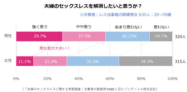 第1報では、既婚者の約7割が配偶者とセックスレス(※1)傾向であり、そのうち4割以上が完全なセックスレス状態と判明しました。では、レス当事者は果たして夫婦間のセックスレスを解消したいと考えているのでしょうか? レス当事者の既婚男女635人に尋ねてみました。