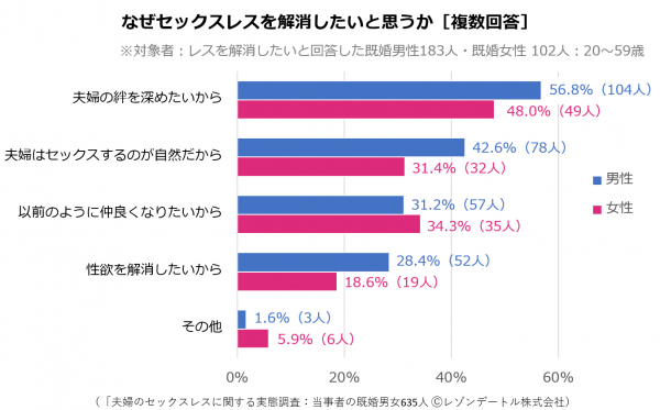 調査対象のレス当事者635人のうち、男性の57.2%、女性の32.4%が「夫婦間レスを解消したい」と思っていることが判明しました。では、これらの人々はなぜ解消したいと思っているのか、その理由を尋ねてみました。
