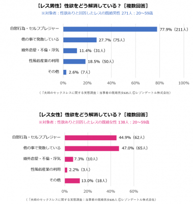 ●レス男性の性欲解消法は「自慰」が約8割で最大、レス女性は「他の事で発散」が最大で約5割